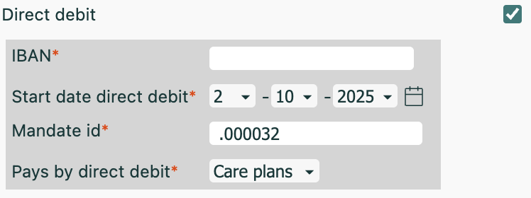 In the field Pays via direct debit, choose whether the client pays all invoices or only care plans by direct debit.