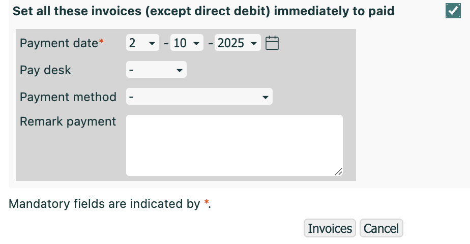Only standard invoices will be marked as paid if you select the option Set all these invoices (except direct debit) immediately to paid.