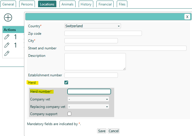 The registration will be done for animals with a main address in Switzerland. For animals categorized as farm animals at SI ABV, it is mandatory to enter a herd number on this address. If there are multiple herds on one location, you need to create multiple locations.