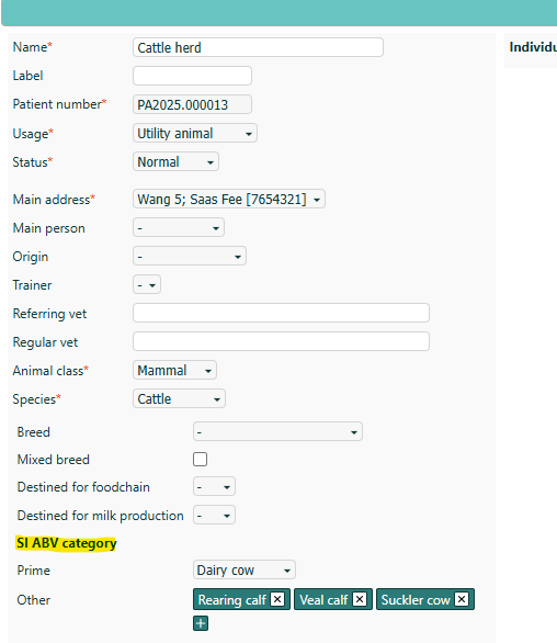 Next to that, the animal needs to have a SI ABV category. If for a species, there is only 1 category in SI ABV, then this category will automatically be filled when you create the animal. If multiple SI ABV categories are available for a species, you can specify the prime category (this category will by default be used) and other categories that are present in the herd:
