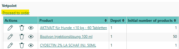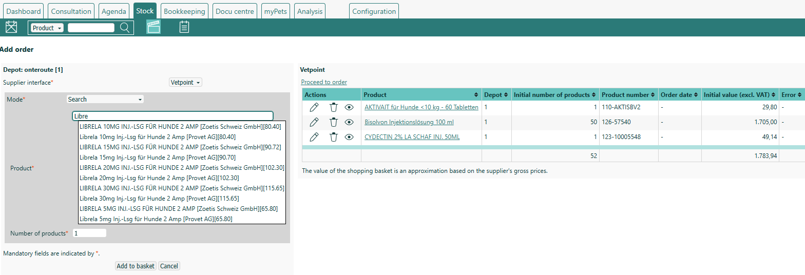 Vetpoint products that have reached the minimum stock are automatically proposed. You can also add products from the Vetpoint catalog to the shopping basket.