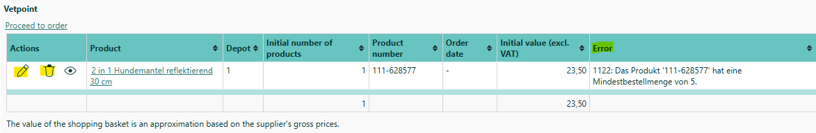 If that is the case, Fuga will keep the product in its shopping basket where you can see why it could not be added to the Vetpoint shopping basket. You can then either correct the line (for example put the minimum quantity) or remove it from your Fuga shopping basket.