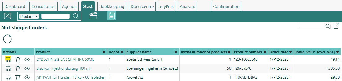 When the supplier delivers the products, go to the Not-shipped orders report on tab Stock. Here you find the products that you sent from Fuga to the Vetpoint shopping basket. To be able to use these products: