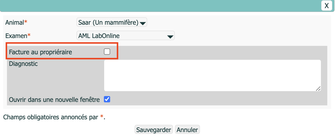 Lorsqu'il est activé, si vous créez un examen AML LabOnline en décochant la case "Facturer au propriétaire", il sera considéré comme une partie facturable de la consultation.