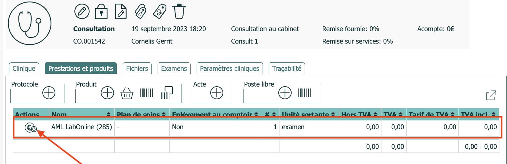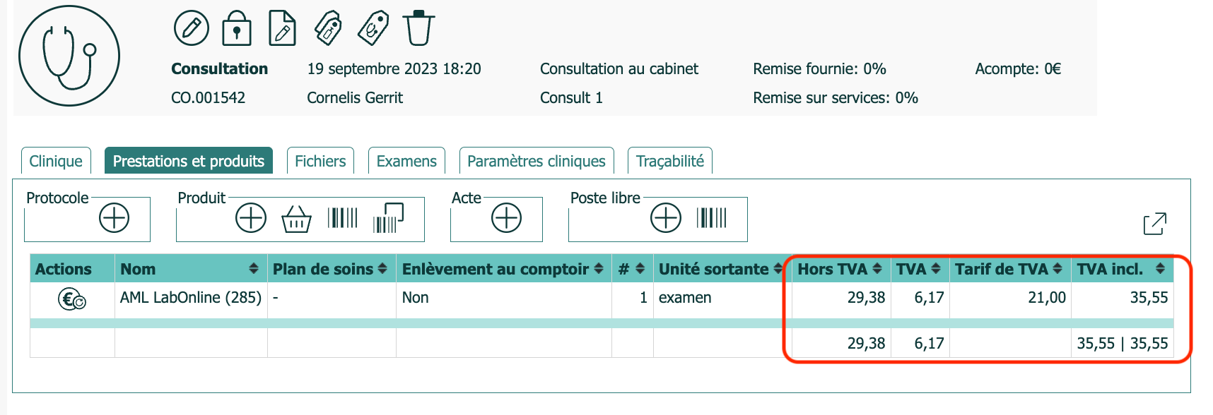 Si, comme prévu, la communication réussit, le prix est affiché dans la liste. Notez que les remises n'affectent pas les examens et que le taux de TVA est déterminé par AML LabOnline.