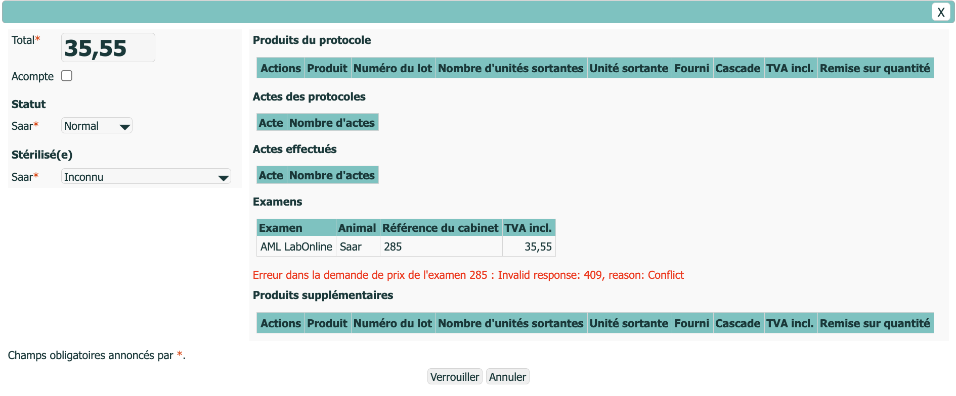 Lors du verrouillage, le prix est de toute façon récupéré, au cas où vous auriez effectué des modifications dans l'application AML LabOnline. Les enquêtes ont été regroupées sur cet écran. Les éventuelles erreurs de communication avec AML LabOnline y sont également indiquées en rouge