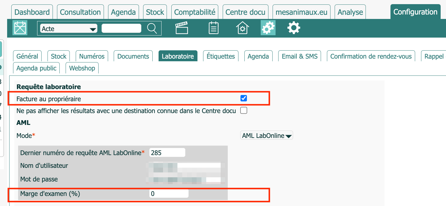 Pour l'activer, cochez la case "Demander les prix à AML LabOnline" dans les préférences du cabinet sur l'onglet laboratoire. Vous pouvez également définir une marge ici.