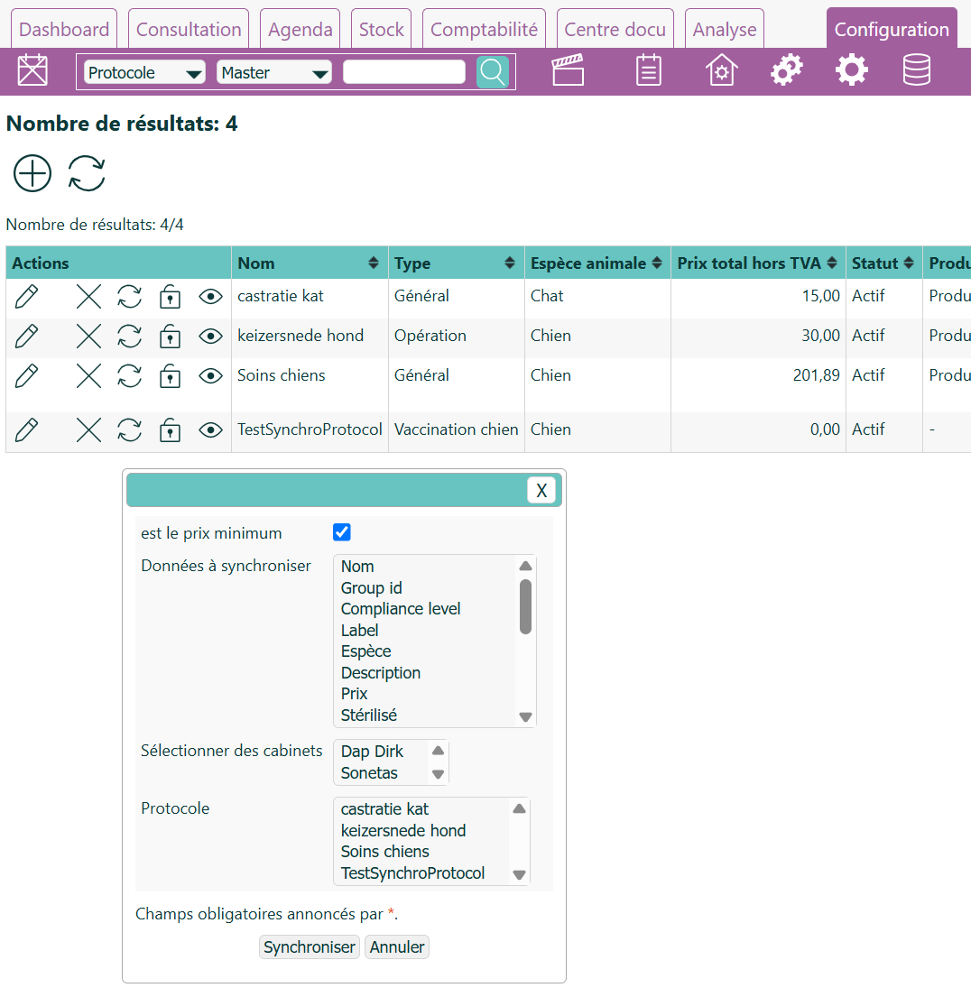 Pour synchroniser des protocoles existants, suivez les mêmes étapes que pour la synchronisation de nouveaux protocoles. La différence est que les options sélectionnées seront automatiquement mises à jour si le protocole a déjà été synchronisé vers le(s) cabinet(s) choisi(s) auparavant.