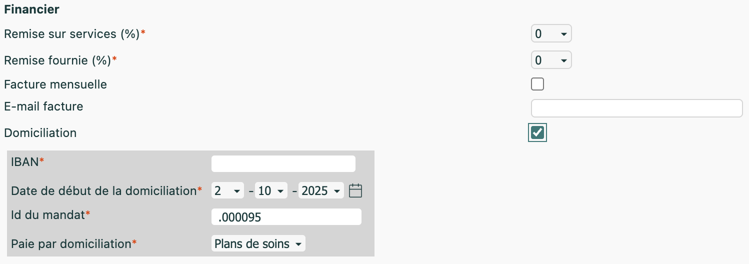 Dans le champ Paie via domiciliation, vous choisissez si le client paie toutes les factures ou seulement les plans de soins via direct debit.
