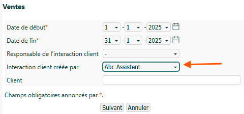 Dans les rapports sur les ventes et les consultations, vous pouvez désormais également filtrer par le collaborateur qui a créé l'interaction client. Cela est particulièrement utile lorsque le responsable de l'interaction client a été rempli automatiquement (par exemple, lors d'une vente à un troupeau, le vétérinaire d'entreprise est automatiquement renseigné).