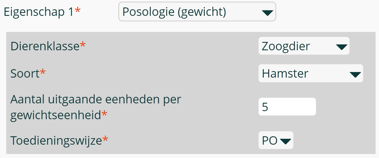 Eerst en vooral kiest u een dierenklasse en een diersoort. Nadien bepaalt u het aantal uitgaande eenheden van het product per gewichtseenheid. Houd hierbij rekening met het feit dat het gewicht in Fuga geen vaste eenheid heeft, aangezien een paardendierenarts andere standaarden heeft dan een dierenarts die bijvoorbeeld enkel kleine knaagdieren behandelt. De verhouding kiest u dus zelf. Ten slotte duidt u een toedieningswijze aan.