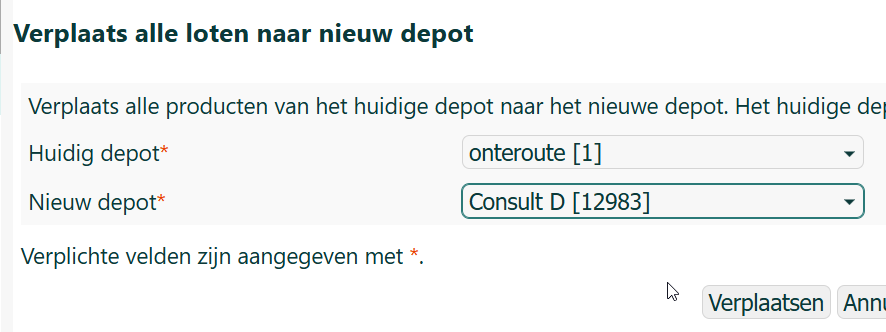 Kies daar het leeg te maken depot, en naar welk depot de stock verhuist + Verplaatsen