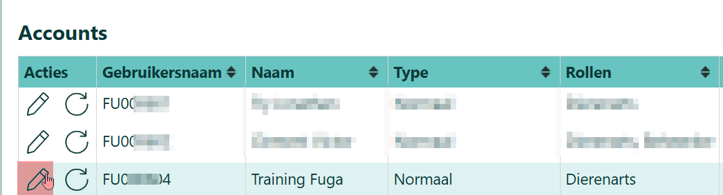 Binnen hetzelfde scherm, heeft u onderaan de Fuga logins staan. U kan de medewerker ontkoppelen van het Fuga loginaccount (via het potloodje) en het account (indien gewenst) schriftelijk opzeggen via een mail naar fuga@sonetas.eu met ingang per de opvolgende maand.