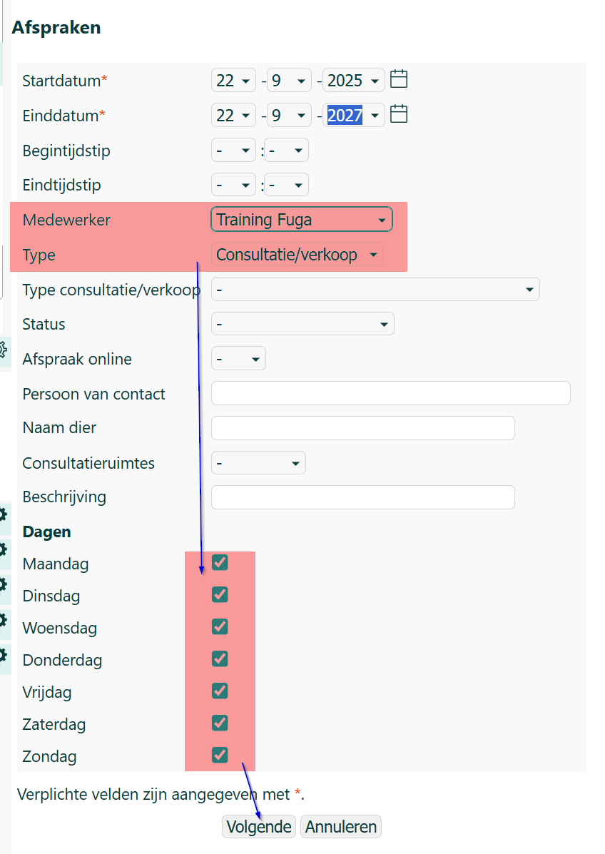 Duid opnieuw een ruimere periode aan, de betreffende medewerker en verwijder de afsprakenblokken. Hierdoor kan men online geen nieuwe afspraken meer inplannen bij deze (ex)-medewerker.