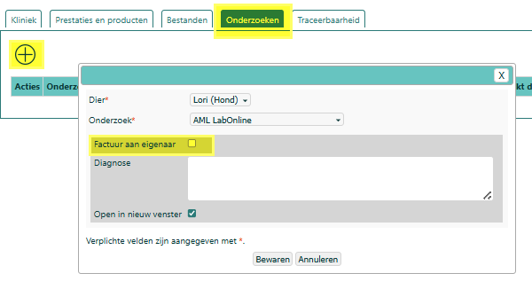 Instellingen > Praktijkvoorkeuren > Labo. Als bij Labo-aanvraag 'Factuur aan eigenaar' aangevinkt is, dan zal Fuga dit automatisch aanvinken bij de consultatie. Fuga voegt het onderzoek toe aan de lijst met prestaties en producten.